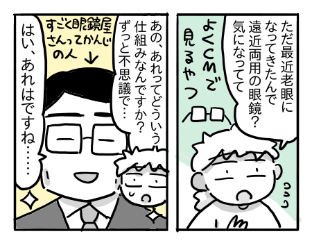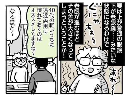 カテゴリ : たまこ 老眼初心者物語③【眼鏡屋さんの心遣い】 2026年01月26日 公式LINEがリリースされました!友達登録してね~♪↓友達登録はこちらから↓https://lin.ee/WYjaveG登録者数3000人突破!ありがとうございます♪前回はこちら↓ この話を最初から読む★その③どうぞ~♪遠近両用レンズの説明を色々してもらって、それなら1回使ってみるか! ... 続きを読む
